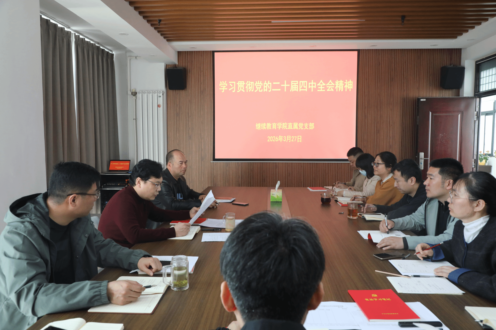 3月27日下午,继续教育学院直属党支部以“深学细悟全会精神 赋能继续教育高质量发展”为主题,组织开展主题党日活动。本次活动以学习贯彻党的二十届四中全会精神为核心内容,严格按照学校要求,通过“集中学习+专题研讨”的培训形式,促进了学习成果向工作思路与履职能力的有效转化。全体党员及科级以上干部参加,活动由直属党支部书记杨天宏主持。