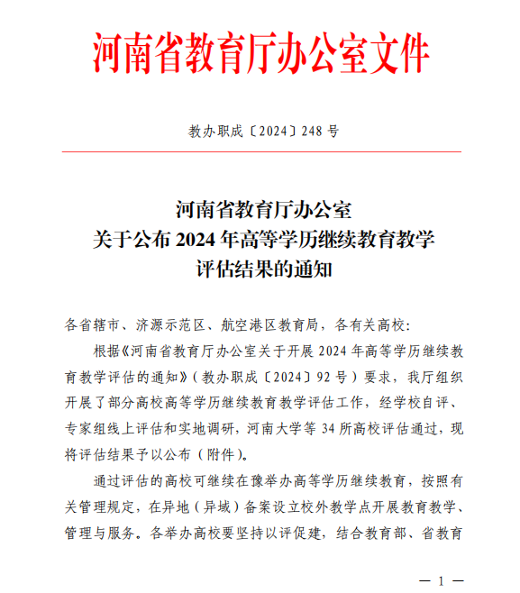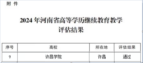 近日,河南省教育厅下发《关于公布2024年高等学历继续教育教学评估结果的通知》(教办职成〔2024〕248号),我校顺利通过高等学历继续教育教学评估。